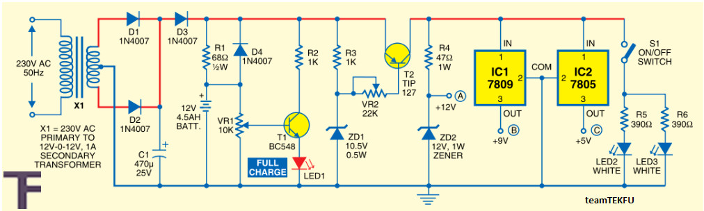 ![]() ![]() عذرا لم نتكلم عن فائدة الترانزستور t2 فهو هنا يحدد قطع الخرج اذا كانت البطارية هابطة اي بعد وصول الجهد فيها اقل من 10.5V سوف لايكون الزنر ZD2 في حالة توصيل قاعدة الترانزستور T2 الى الخط السالب وبما انه pnp سيكون في حالة open circut ولا يصل الجهد للمنظمين 7809 و 7805 بقي لنا النقطة A هي ايضا احدى مخارج الدائرة تعطينا جهد كحد اعلى 12V ولكن بتيار بسيط قد لايتجاوز 250 ملي امير اي 1/4 امبير. تحياتي لك بالموفقية والنجاح . |