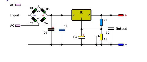 تفضلوا الدارة بدون اطالة صراحة لم اجربها ليس لدي بعض المكونات مثل IC LM317 قائمة أجزاء LM317 IC P1 = 4.7K R1 = 120R C1 = 100nF - 63V C2 = 1UF - 35V C3 = 10uF - 35V C4 = 2200uF - 35V D1-D4 = 1N4007 |