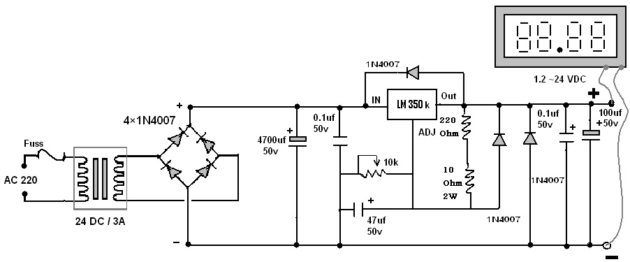 تقوم الدائرة بتوفير جهد مستمر من 1.2 إلى 24 فولت ويتم التعديل على الفولت بواسطة المقاومة المتغيرة الموجودة في الدائرة فتسطيع التحكم في ال جهد المستمر الناتج بي 1.2 إلى 24 فولت هذه الدائرة هي شبيها بالدوائرة الموجودة في اجهزة (الفولتيج ريجولاتور) وهذا الجهاز هو اداة من ادوات الورشة الالكترونية او المعامل الالكترونية فهذه ال دائرة تقوم بدور هذا الجهاز والذي يحتاج إليه كل هاوي او دارس للالكترونيات. البور سبلاي ![]() الدائرة الالكترونية.... ![]() الصورة العميلة.... مقتبس من Electronic Bubble |