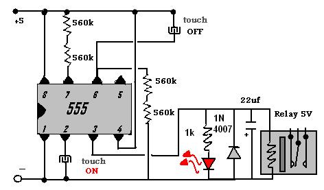 ,الدائرة تعمل على تشغيل ريليه 5 فولت وفصله باللمس ،وبالريليه يمكن تشغيل و إطفاء الأجهزة الكهربائية ويصبح مفتاح كهربي يعمل باللمس