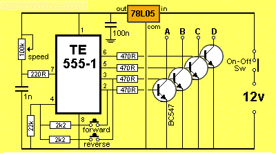 تقوم الدائرة بتشغيل محرك الخطوة ذات المخارج المتعددة والموضح في الصورة والتحكم في سرعته بواسطة المقاومة المتغيرة الموجودة في الدائرة الالكترونية