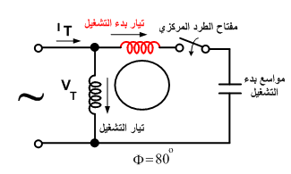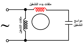 نفس ما سبق ولكن يوصل عللى التوالي مع مفتاح الطرد المركزي وملف البدء مكثف تكون قيمته لا تقل عن 40 مايكروفاراد يصل احيانا الى 300 او 400 مايكروفراد تقريبا وظيقته زياده الزاويه الكهربائيه بين ملفات البدء وملفات الحركه لاعطاء عزم بداية دوران عالي للمحرك ثم يخرج ملف البدء والمكثف ومفتاح الطرد المركزي من الدائره بعد 75 % من سرعة دورانه