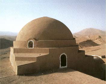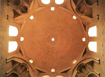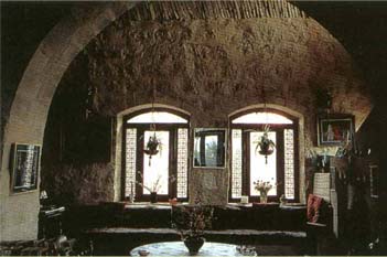 منظر داخلي لأحد البيوت التي بناها حسن فتحي.. يمكننا أن نستوعب قدرته على منح المعمار صبغتيه الجمالية والوظيفية.. حيث كان يقول دائما: الخط المستقيم هو خط الوظيفة، أما المنحنى فهو طريق الجمال. وكان يرى العمارة تنبعث من الحلم؛ وهو ما يبرر في نظره اختلاف كل بناية عن الأخرى.