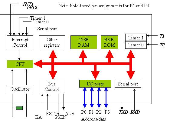 احدى عائلات الميكروكونتروللر و التى تم تصميمها و انتاجها بواسطة شركة انتل ثم ظهرت بعض الشركات الاخرى لتنتج نفس العائلة مثل :-و كانوا حاصلين على الترخيص بانتاج هذا الجيل . تم طرح المنتج المعروف بـ ( 8051 ) كتطوير لهذا الجيل تجارياً و تتلخص خصائصه فى الاتى : 1- ذاكرة تخزين داخلية ثابتة من النوع ( ROM ) بسعة 4 كيلوبايت مع امكانية الاتصال بذاكرة خارجية من نفس النوع بسعة 64 كيلوبايت كحد اقصى . 2- ذاكرة تداول داخلية عشوائى من النوع ( RAM ) بسعة 128 بايت مع امكانية التوصل بذاكرة خارجية من نفس النوع بسعة 64 كيلو بايت كحد اقصى 3- عدد ( 4 ) منافذ توصيل كل منها بسعة 8 بت للادخال و الاخراج . 4- عدد ( 2 ) مؤقت بقدرة 16 بت . 5- امكانية الاتصال التسلسلى . 6- معالج منطقى ALU 7- عدد 210 موقع فى الذاكرة يمكن استدعاؤها على مستوى البت . 8- زمن تنفيذ عملية الضرب او القسمة هو 4 مللى ثانية . ثم ظهر بعد ذلك عدة اجيال كتطويرات لهذا الجيل تتلخص فى التالى :.. 8051 التالى هو الرسم التوضيحى (( المبسط )) لمكونات الميكروكونتروللر 8051