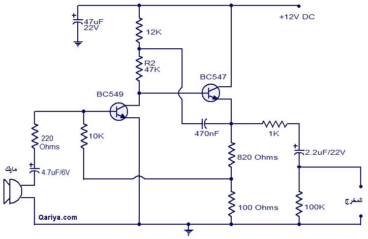 وصف الدائرة الالكترونية : مكبر صوت أولي Preamplifier يقوم بتكبير اشارة مكيروفون من النوع الديناميكي Dynamic microphone