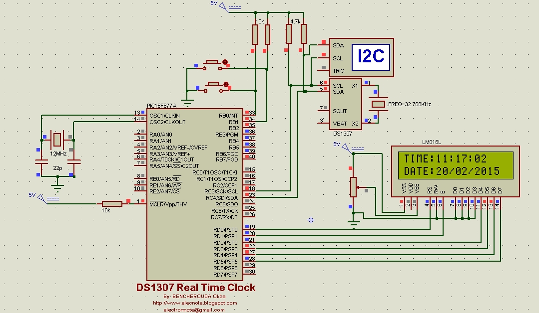 الـ DS1307 تستعمل البروتوكول I2C للاتصال مع الجهاز الرئيسي في الدارة الالكترونية والذي هو هنا الميكروكنترولر PIC16F877A.