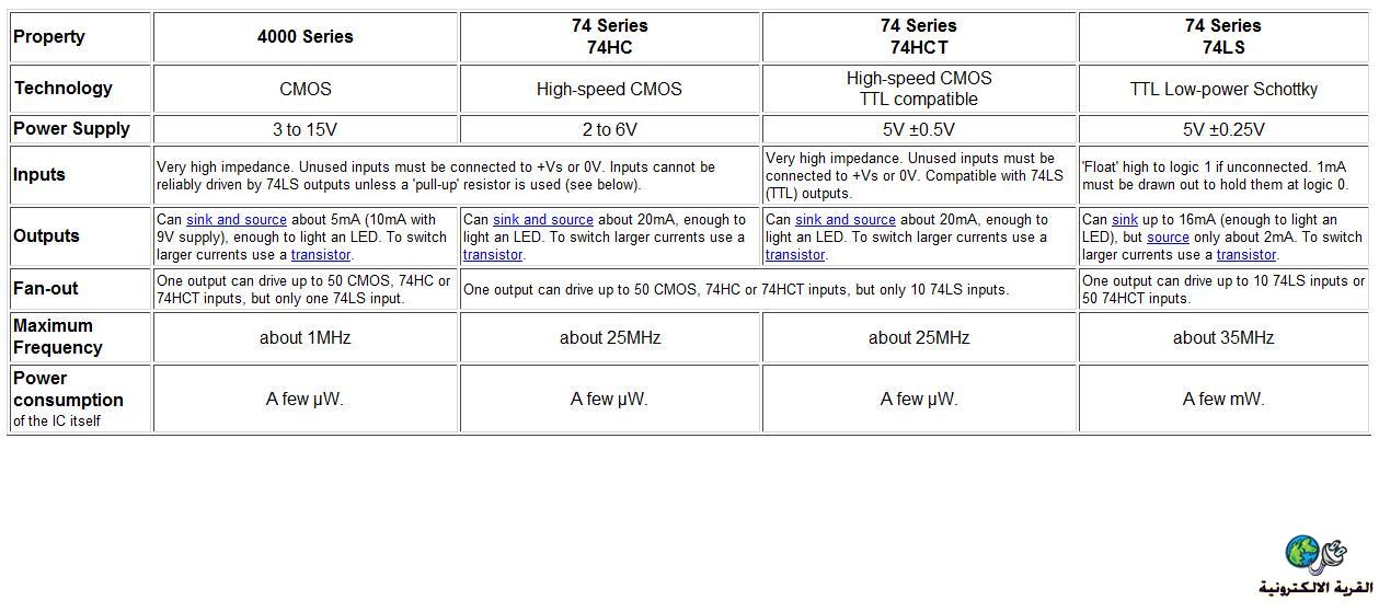 مثل : 4000 4001 4011 .... الخ والعائلة الأخرى 7400 7404 7411 ..... الخ إذا كان الأمر كذلك فأرجو ان تفيدك هذه المقارنة ![]() للاستزادة يمكنك الاطلاع على هذين الرابطين http://www.kpsec.freeuk.com/components/cmos.htm http://www.kpsec.freeuk.com/components/74series.htm |